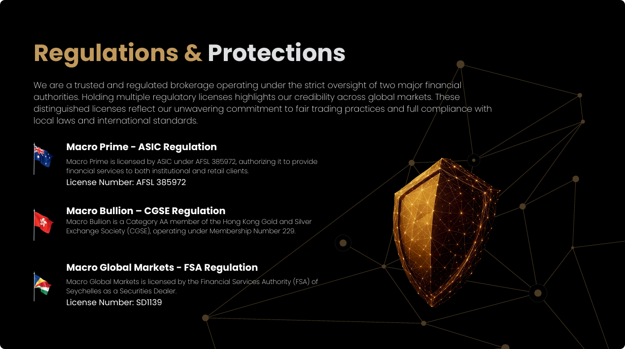 作为全球外汇交易领域的「常青树」,Macro Global Markets 自 2010 年踏浪启航,十二载深耕不辍,早已在国际金融市场构筑起深厚护城河。其背后的「监管矩阵」堪称豪华 —— 澳大利亚 ASIC 以严苛的投资者保护条例著称,香港 CGSE 背靠亚洲金融中心的风控体系,塞舌尔 FSA 则提供灵活高效的监管框架,三大权威机构协同监管,多重合规牌照加持,让每一笔资金都如同存入银行级保险柜,安全感与可靠性拉满。值得一提的是,平台定期接受国际会计师事务所的独立审计,所有交易数据均通过分布式账本技术加密存储,确保交易全流程透明可追溯。